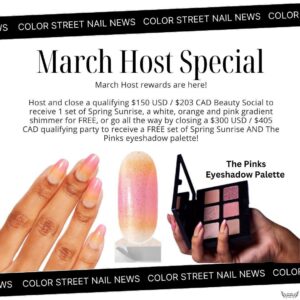 Check out Color Street’s GENEROUS Hostess Reward Program & let me know what YOUR party goal is! 🥳 I recommend aiming for the $300 party because you unlock the special, you have a good percentage in FREE and Half Off credits, PLUS FREE shipping. 🙌🏻 I will do my BEST to help you reach your goal.